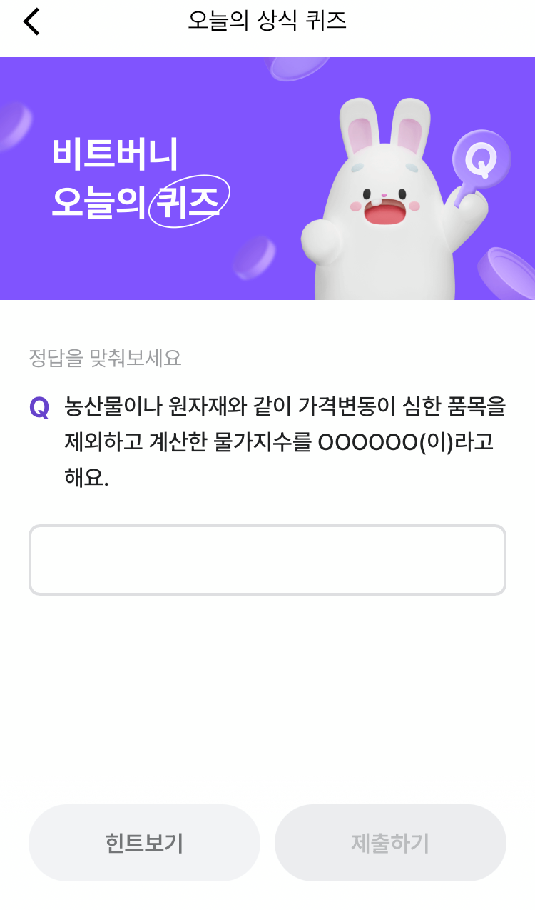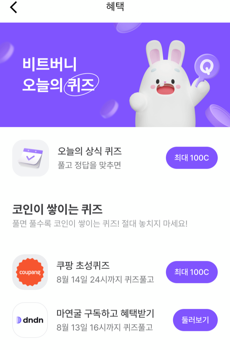 * 비트버니 퀴즈는 오늘의 퀴즈와 코인이 쌓이는 퀴즈가 있어요!!