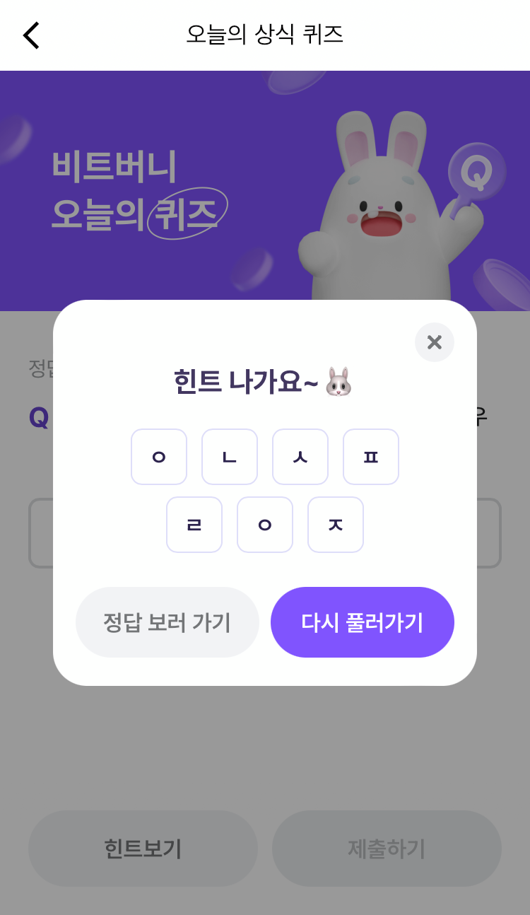* 비트버니 퀴즈는 오늘의 퀴즈와 코인이 쌓이는 퀴즈가 있어요!!