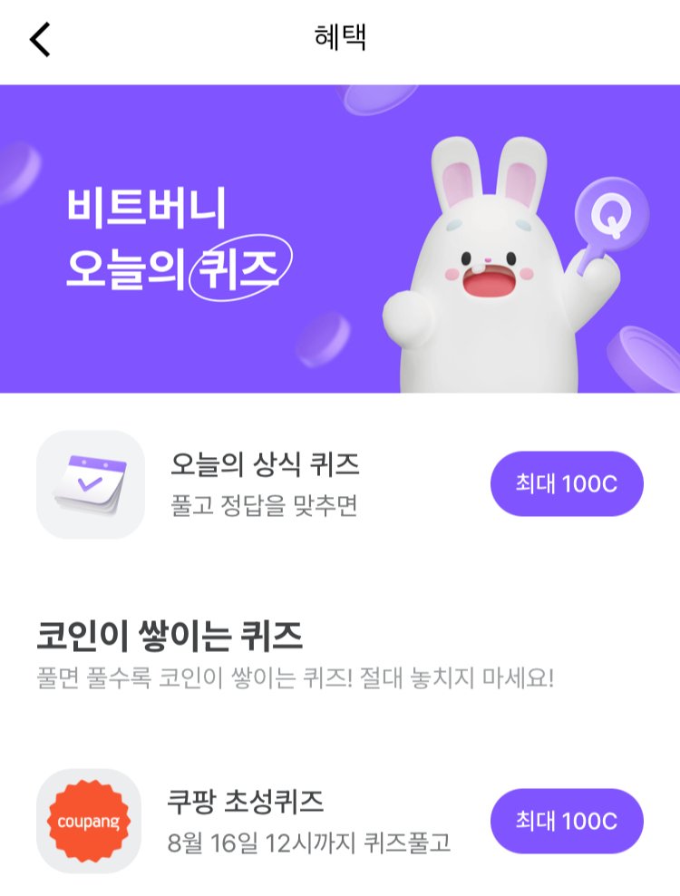 * 비트버니 퀴즈는 오늘의 퀴즈와 코인이 쌓이는 퀴즈가 있어요!!