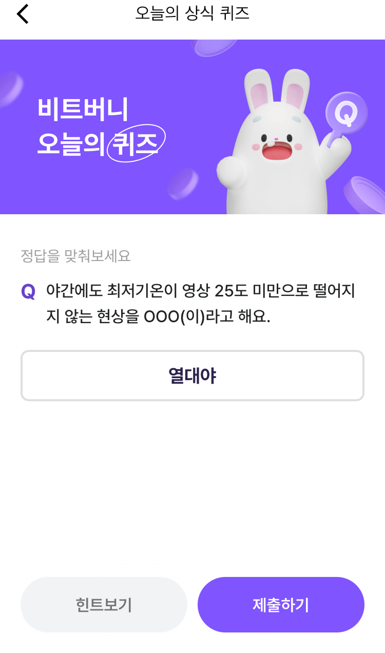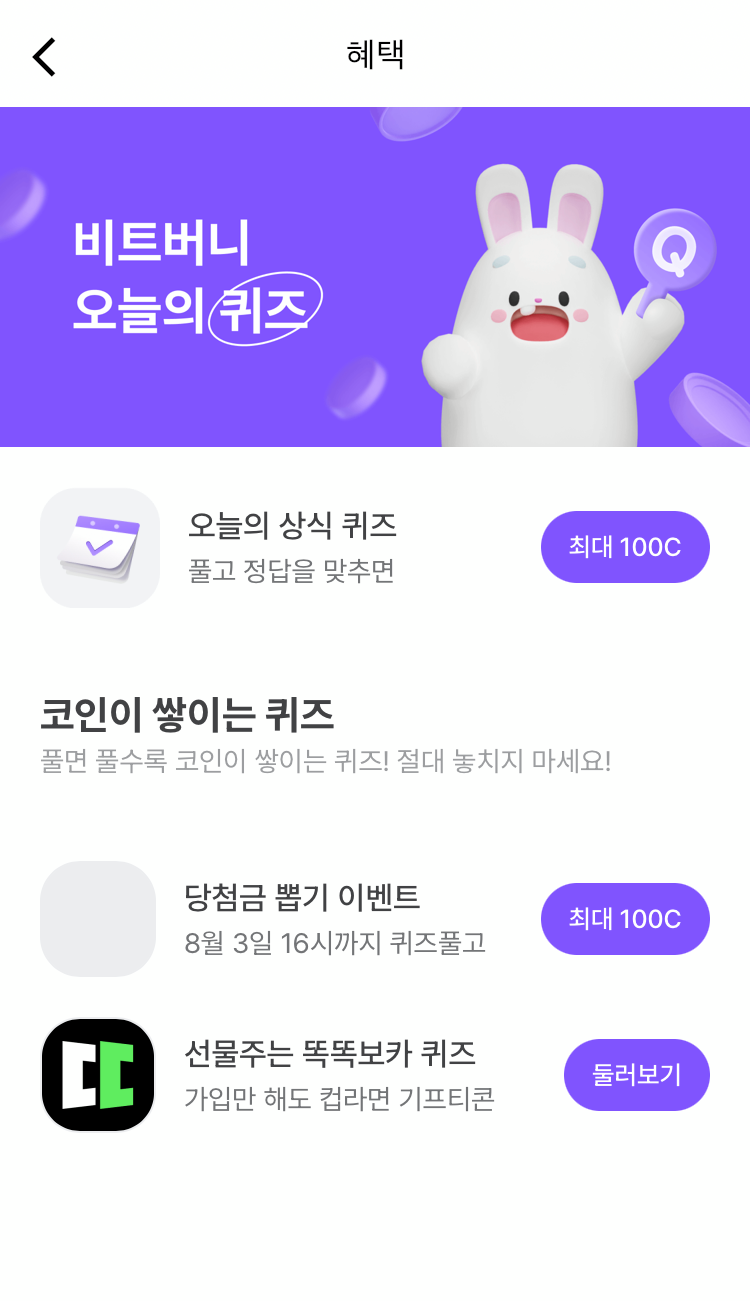 * 비트버니 퀴즈는 오늘의 퀴즈와 코인이 쌓이는 퀴즈가 있어요!!