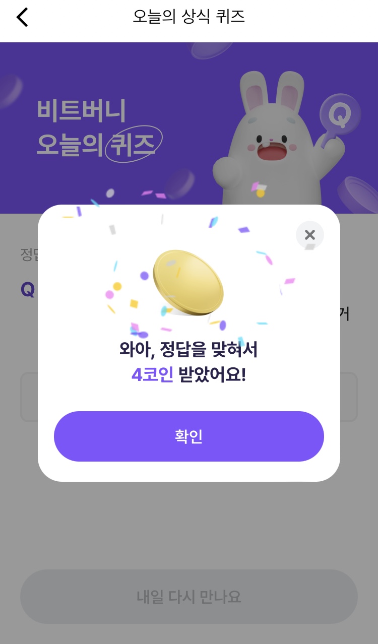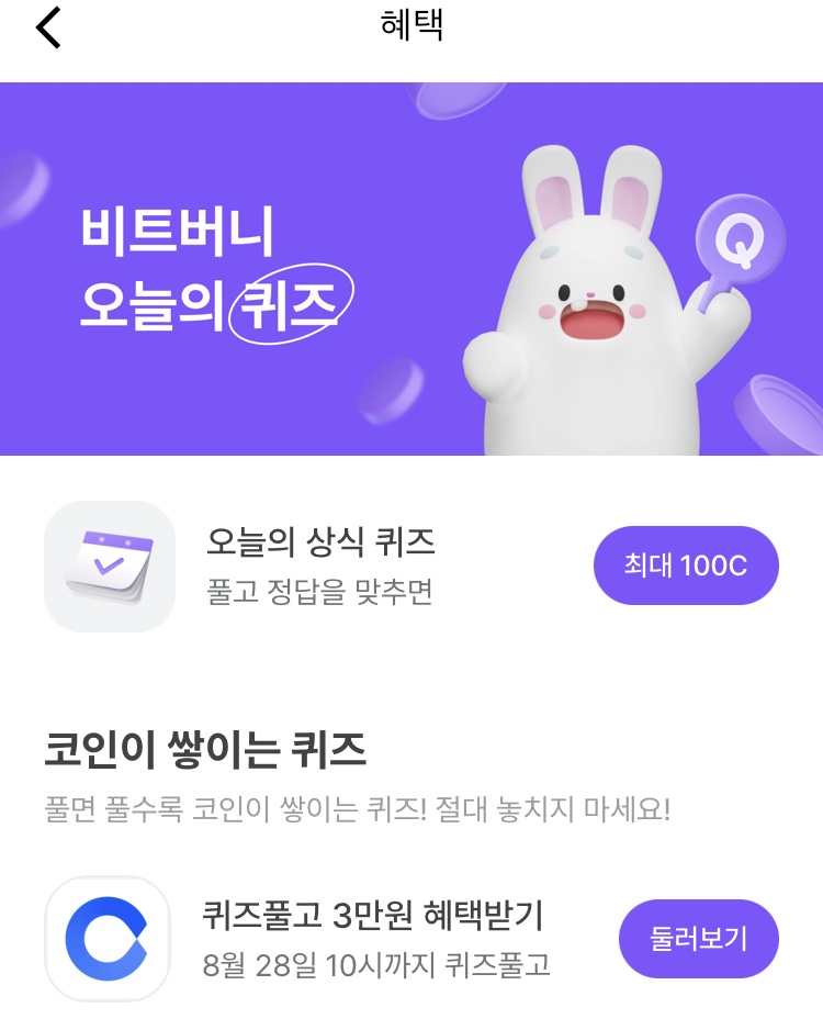 * 비트버니 퀴즈는 오늘의 퀴즈와 코인이 쌓이는 퀴즈가 있어요!!