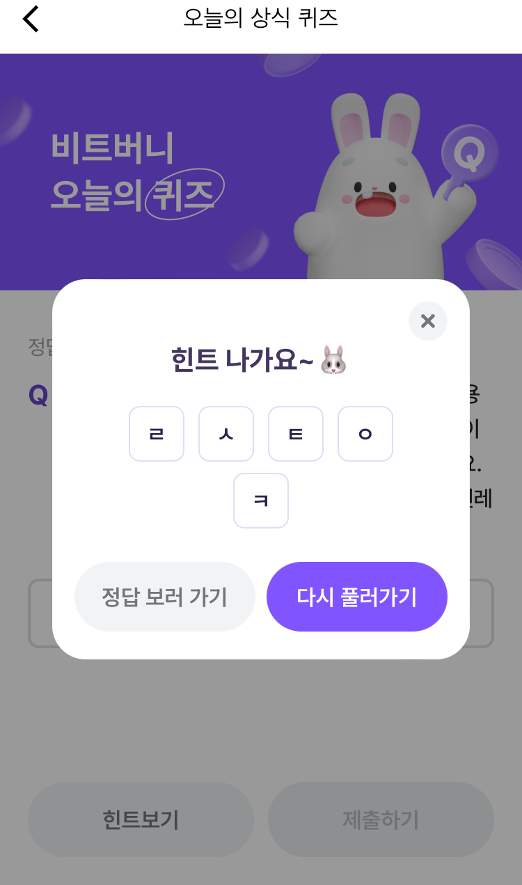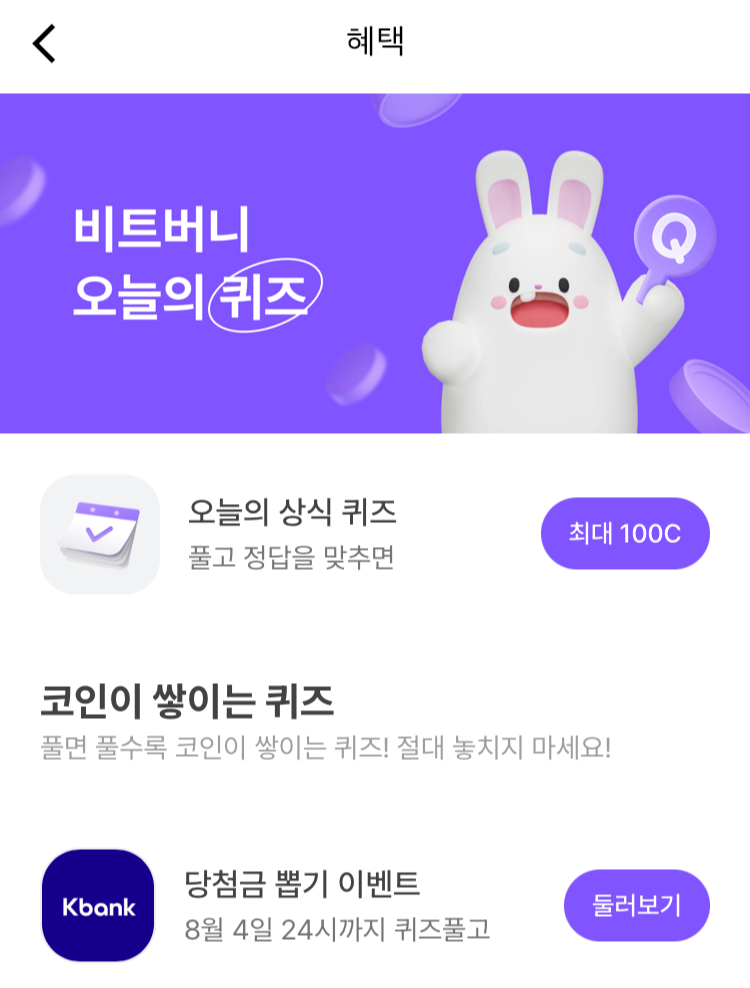 * 비트버니 퀴즈는 오늘의 퀴즈와 코인이 쌓이는 퀴즈가 있어요!!
