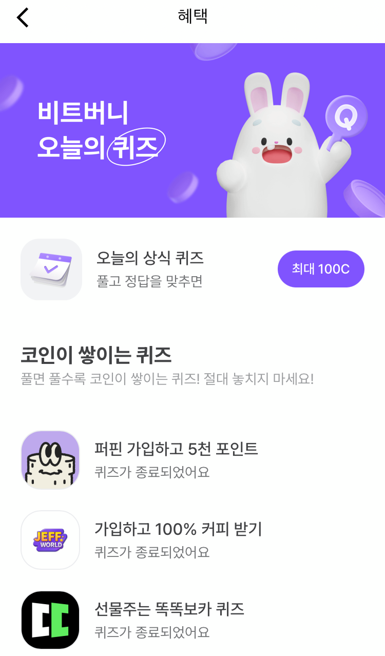 * 비트버니 퀴즈는 오늘의 퀴즈와 코인이 쌓이는 퀴즈가 있어요!!