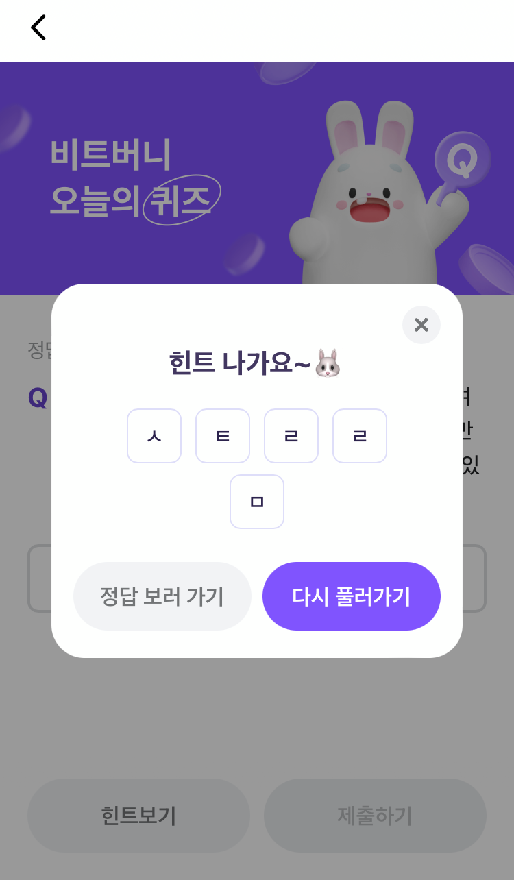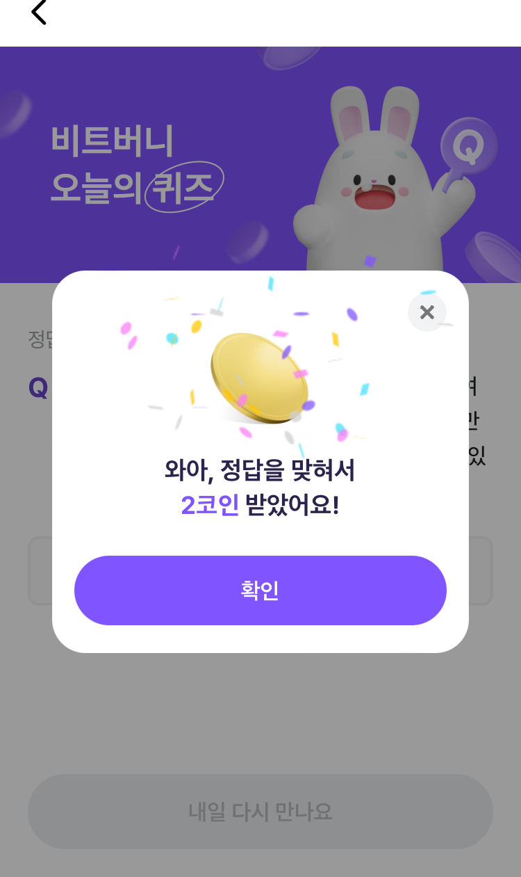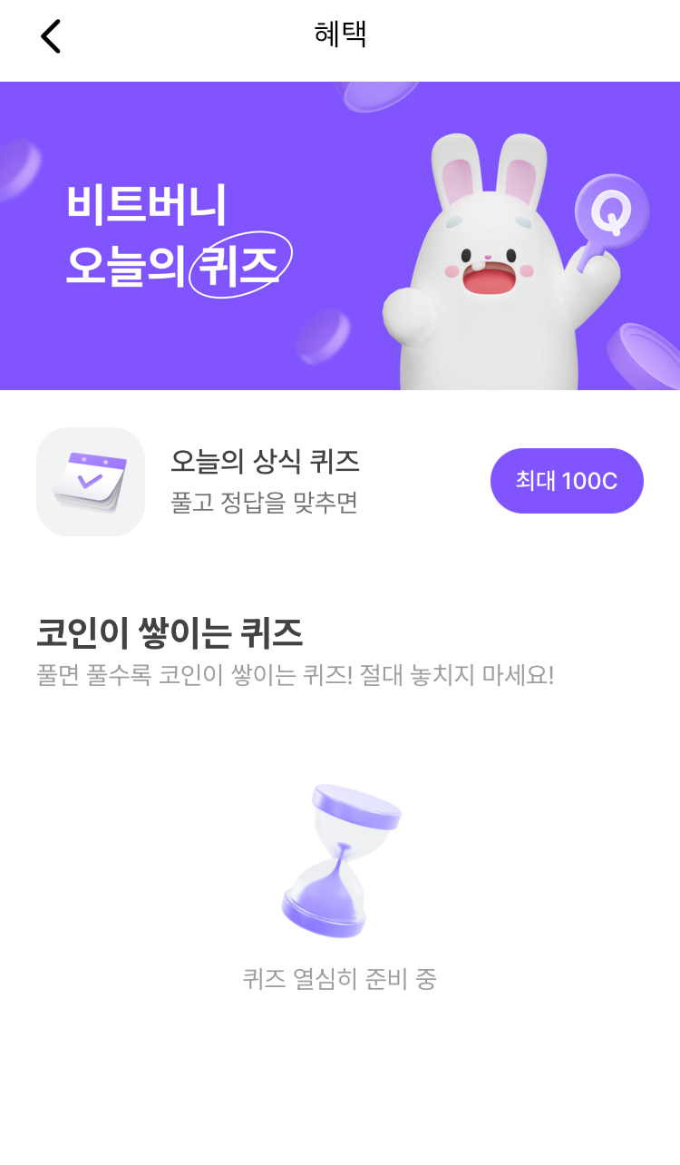 * 비트버니 퀴즈는 오늘의 퀴즈와 코인이 쌓이는 퀴즈가 있어요!!