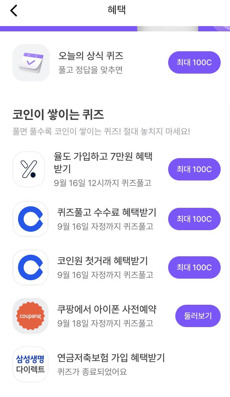 | 비트버니 9월 18일 오늘의 퀴즈 정답 ㅅ 은?(ft.코인이 쌓이는 퀴즈,롯데카드,쿠팡,코인원,삼성생명) (1) | 2024.09.18 |