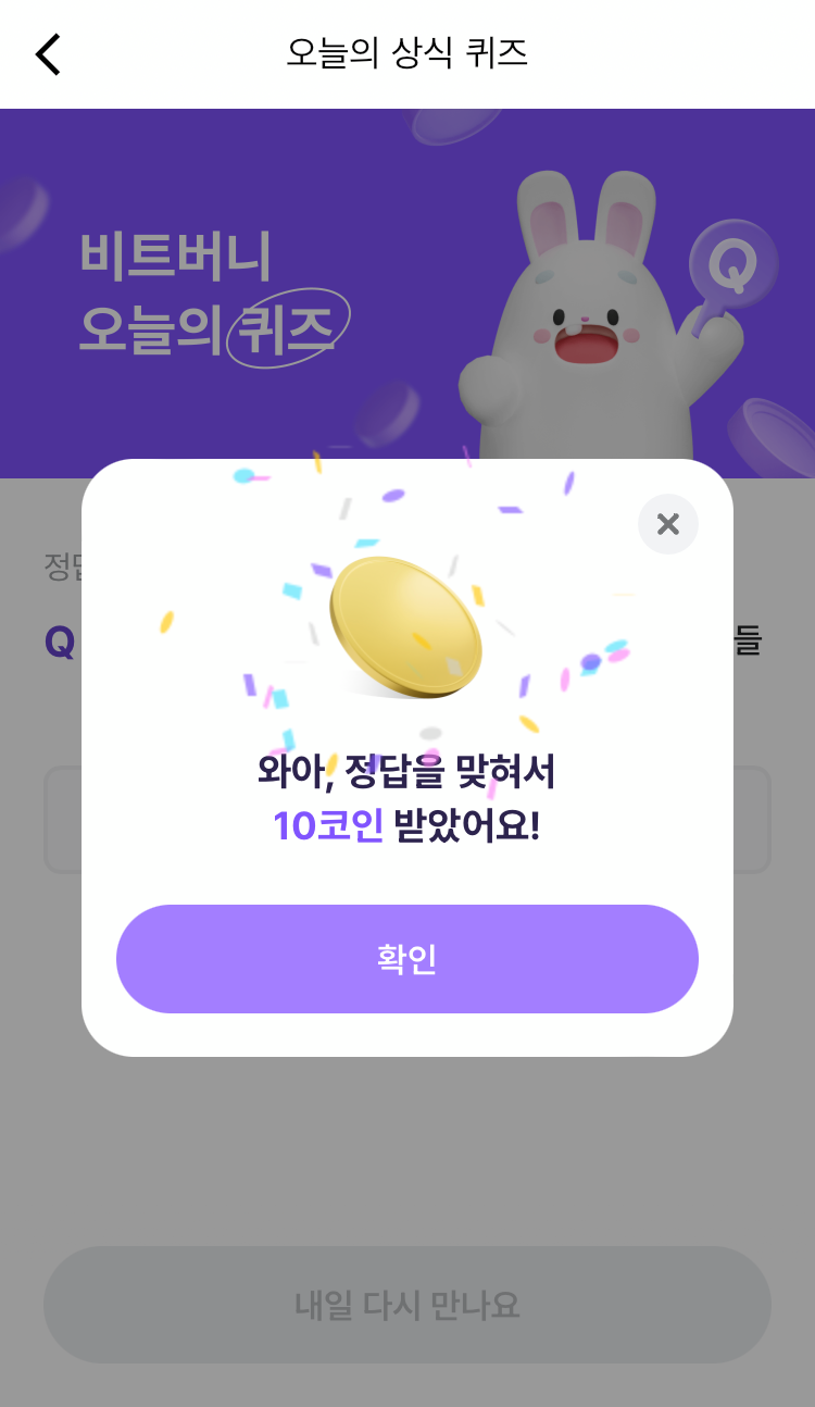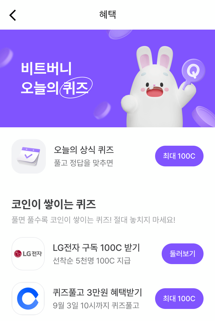 * 비트버니 퀴즈는 오늘의 퀴즈와 코인이 쌓이는 퀴즈가 있어요!!