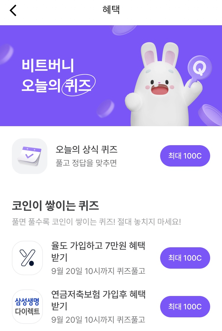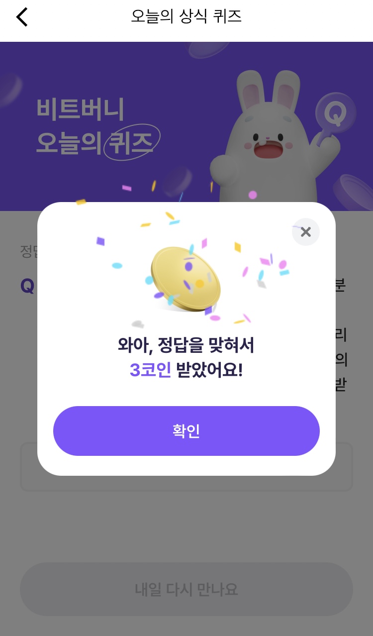 * 비트버니 퀴즈는 오늘의 퀴즈와 코인이 쌓이는 퀴즈가 있어요!!