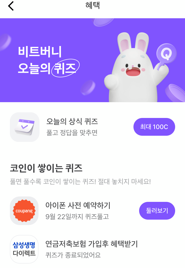 | 비트버니 9월 21일 오늘의 퀴즈 정답 ㅂㅅㅎㄱ은?(ft.코인이 쌓이는 퀴즈,쿠팡,삼성생명) (1) | 2024.09.21 |