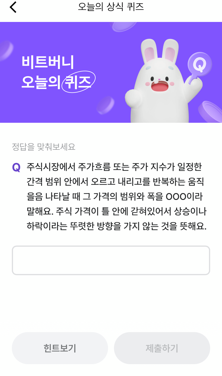 * 비트버니 퀴즈는 오늘의 퀴즈와 코인이 쌓이는 퀴즈가 있어요!!