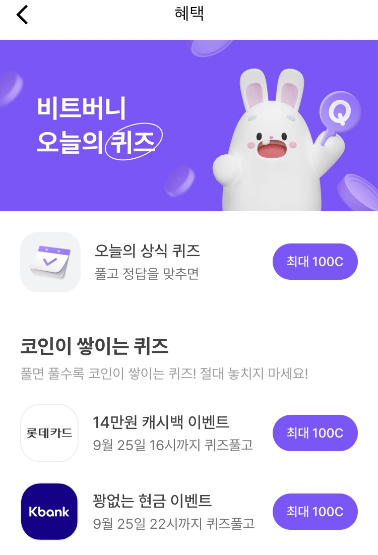 비트버니 9월 25일 오늘의 퀴즈 정답 ㅈㅂㄱㅅ은?(ft.코인이 쌓이는 퀴즈,롯데카드,K뱅크)