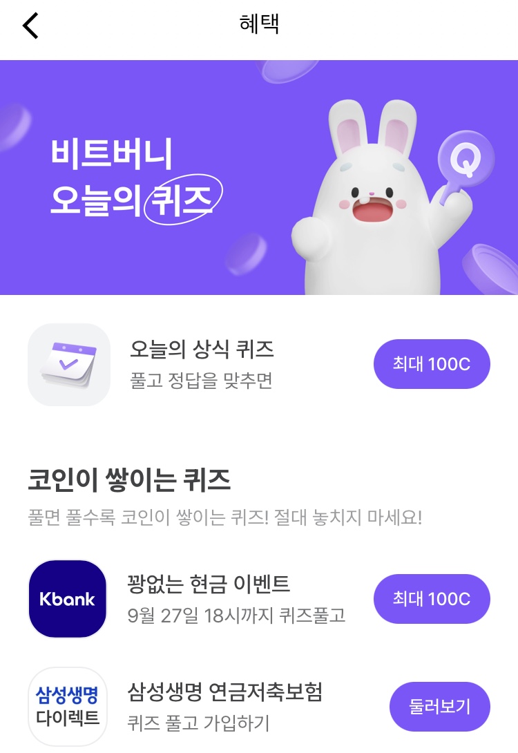 * 비트버니 퀴즈는 오늘의 퀴즈와 코인이 쌓이는 퀴즈가 있어요!!