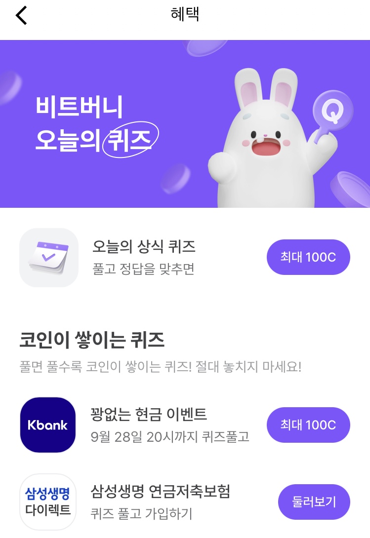 * 비트버니 퀴즈는 오늘의 퀴즈와 코인이 쌓이는 퀴즈가 있어요!!