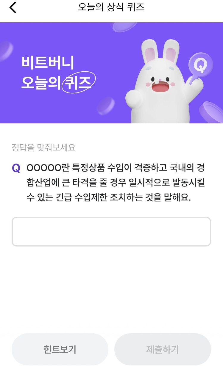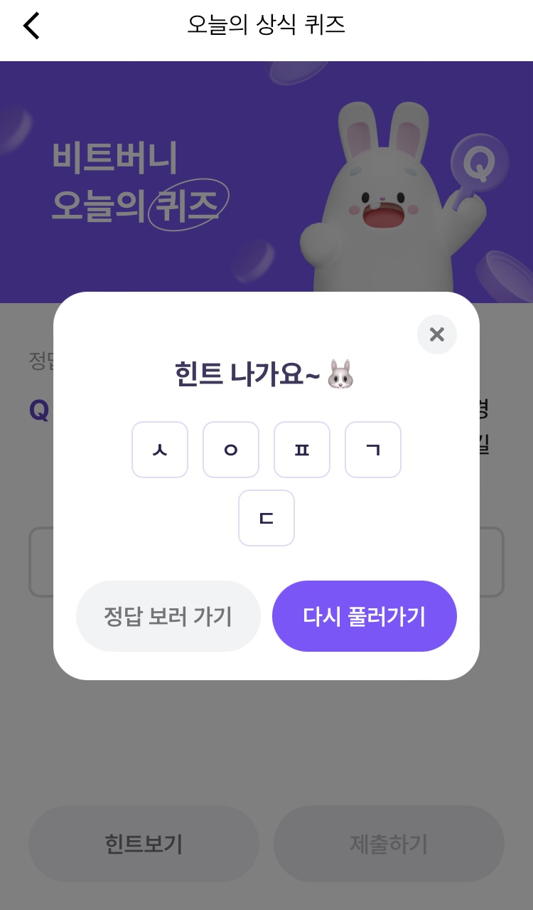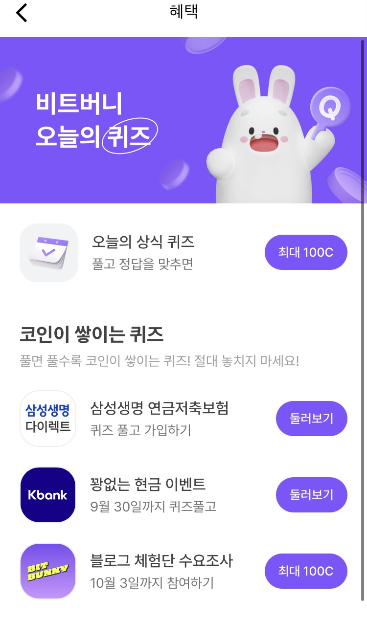 * 비트버니 퀴즈는 오늘의 퀴즈와 코인이 쌓이는 퀴즈가 있어요!!