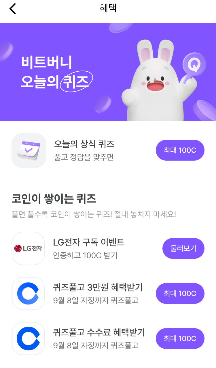 * 비트버니 퀴즈는 오늘의 퀴즈와 코인이 쌓이는 퀴즈가 있어요!!