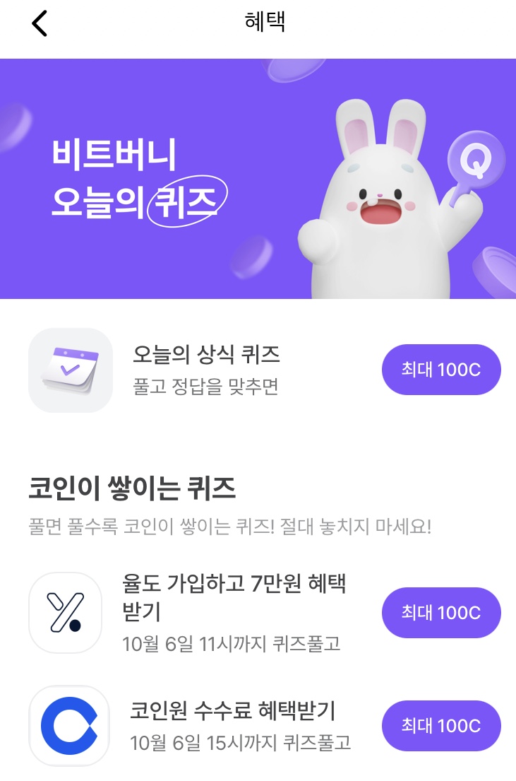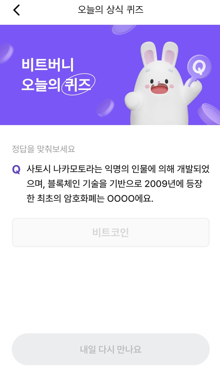 * 비트버니 퀴즈는 오늘의 퀴즈와 코인이 쌓이는 퀴즈가 있어요!!