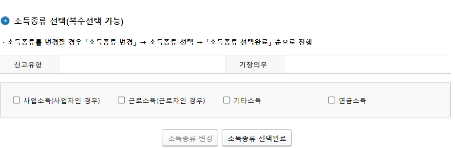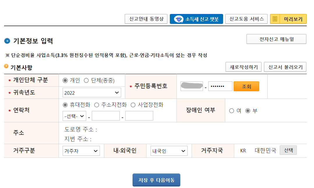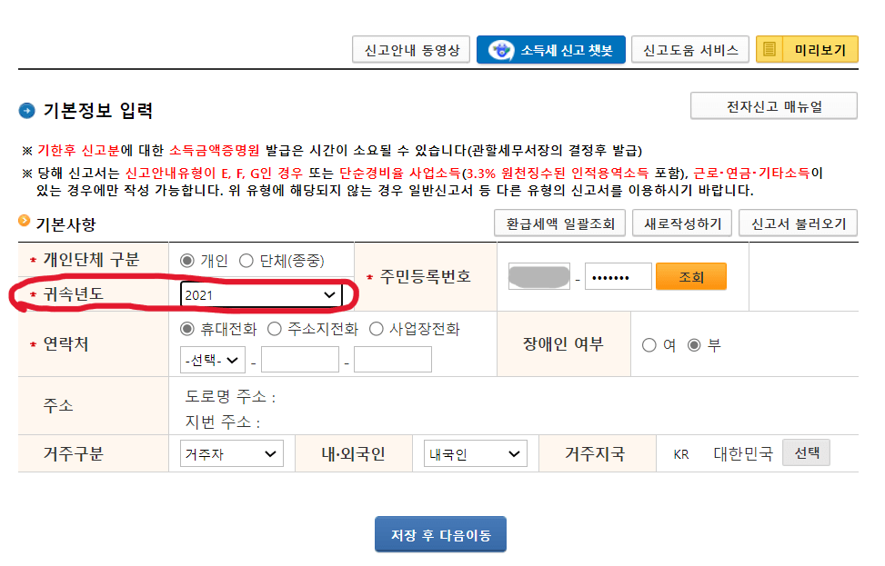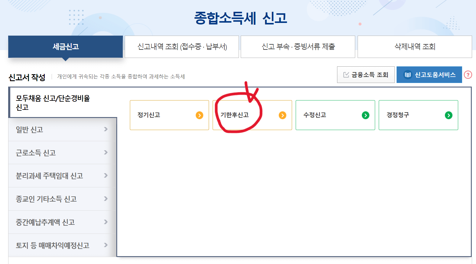 2021년도분은 기한이 지난 후 신고하는 것이기 때문에 '기한 후 신고' 클릭하면 좀 전과 같은 화면이 나온다.