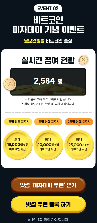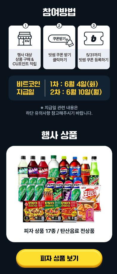피자데이를 기념하여 편의점 CU에서는 5월 26일까지 피자상품 17종(즉석조리 피자, 피자빵, 피자치즈, 피자맛 감자칩 등)과 탄산음료 전상품을 구매하면 최대 25000원 상당의 비트코인을 지급하는 이벤트를 열고 있다.