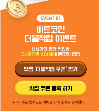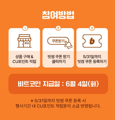 상품 구매 --> CU멤버십 포인트 적립 --> 쿠폰발급(포켓 CU 앱) --> 빗썸 앱에 등록(5월 31일까지)