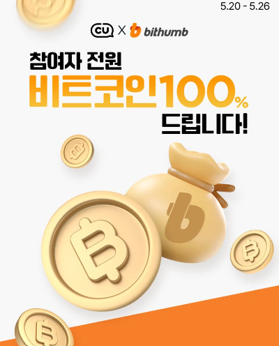 상품 구매 --> CU멤버십 포인트 적립 --> 쿠폰발급(포켓 CU 앱) --> 빗썸 앱에 등록(5월 31일까지)